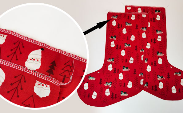 Nun nimmst Du Sockenteile und versäuberst jeweils die obere Stoffkante mit einem Zick-Zack-Stich, oder einer Overlocknaht.