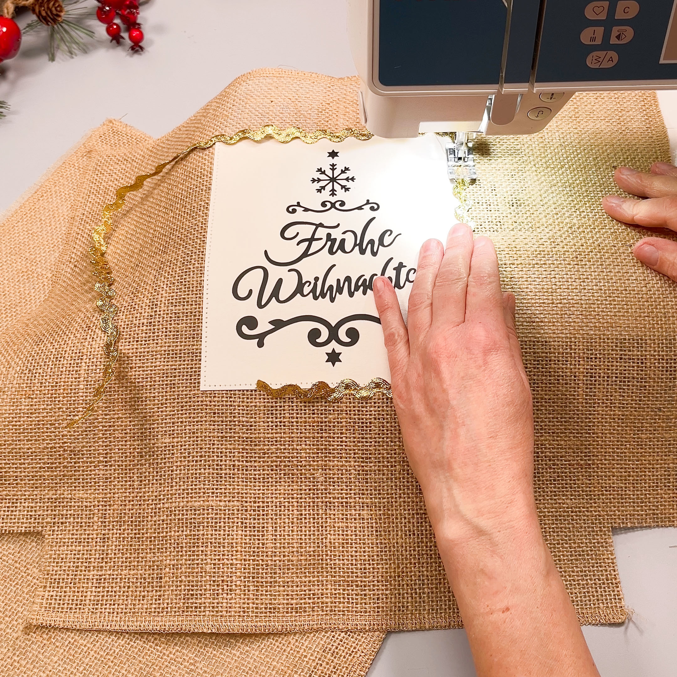 Wenn du ein Vorderseitenmotiv für deine Tasche vorgesehen hast, nähe dies zunächst auf eine der beiden Jutezuschnitte mit einem Geradstich an und verziere das Motiv nach Belieben. Ich habe für die Urandung noch eine goldenen Zackenlitze aufgenäht.