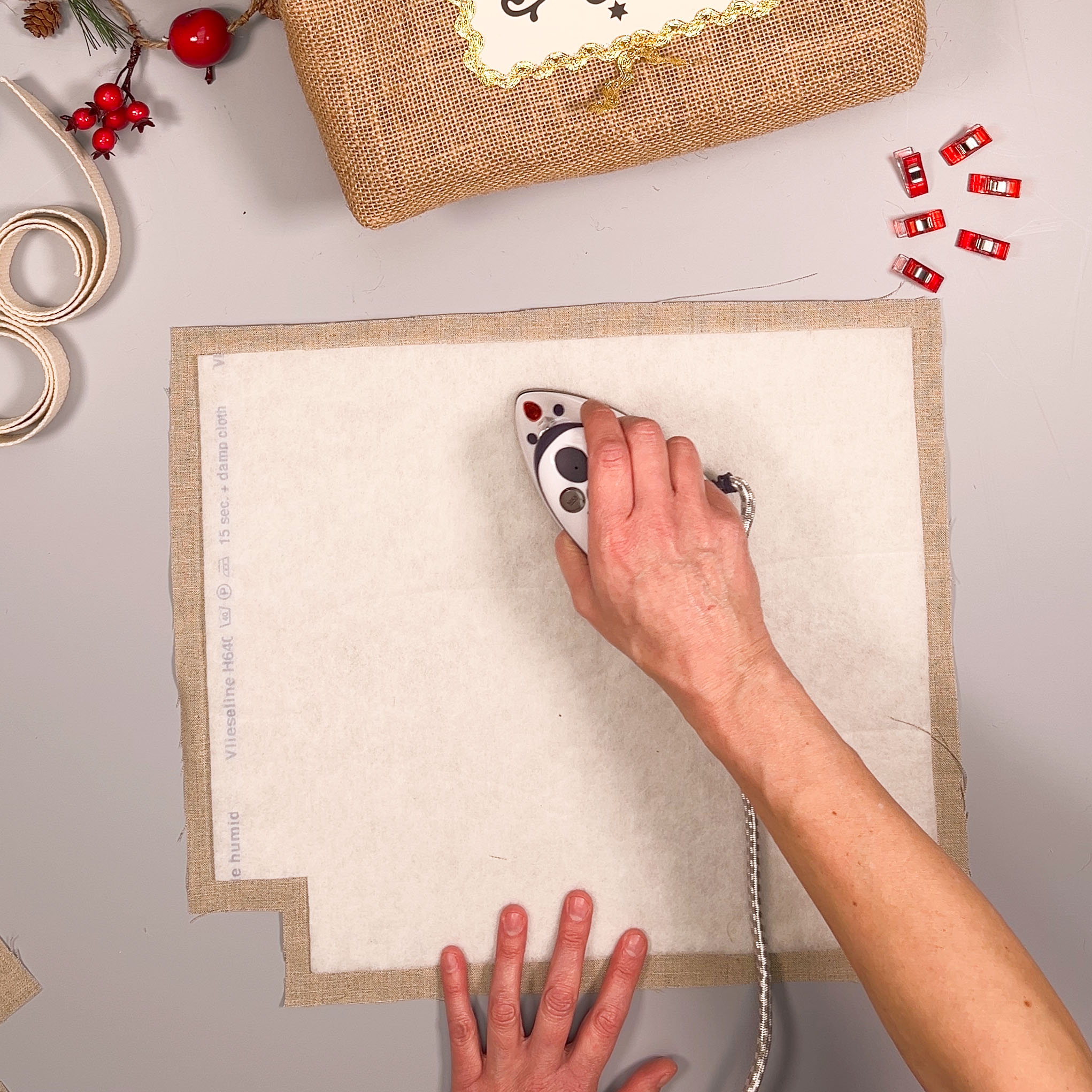 1. Bügele zunächst die Einlage nach Herstellerangaben (siehe Produktrand) auf die linke Seite der Innentaschenzuschnitte…