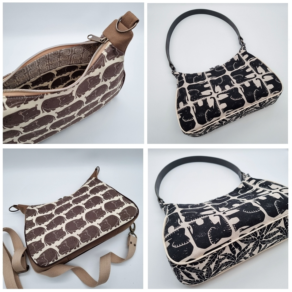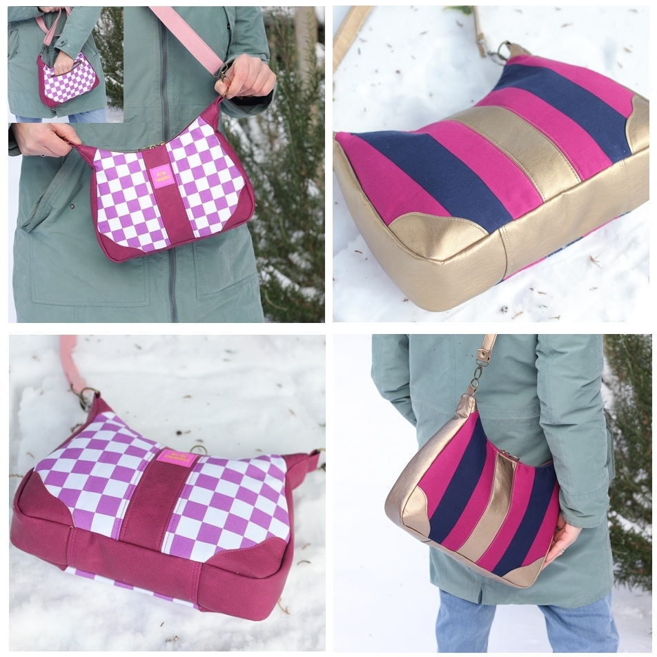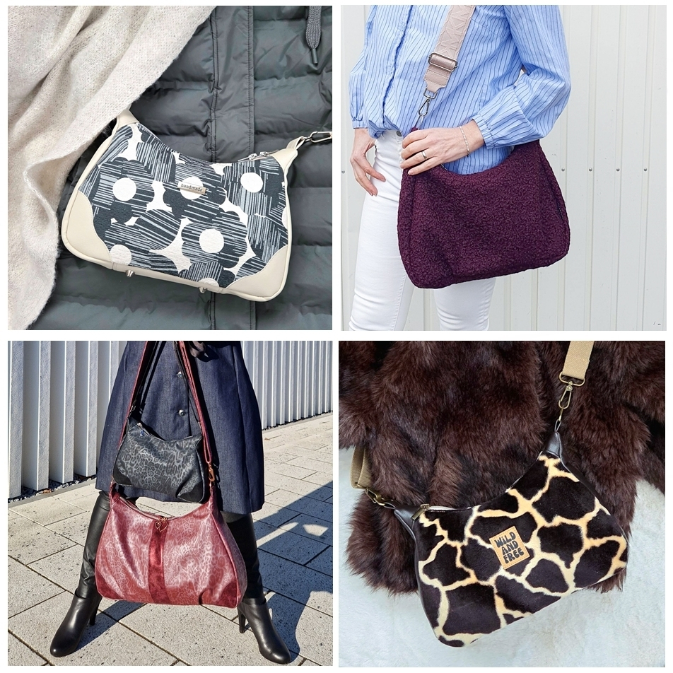 ohHoobi wird komplett mit einem Reißverschluss geschlossen. Für den variantenreichen Look werden die (wechselbaren) Tragegurte in festvernähten Aufhängungen eingehängt. Für die Formgebung arbeiten wir optional eine Paspel ein und hübschen die Außentasche noch mit einem Reißverschlussfach und/oder Eck-Patches auf.